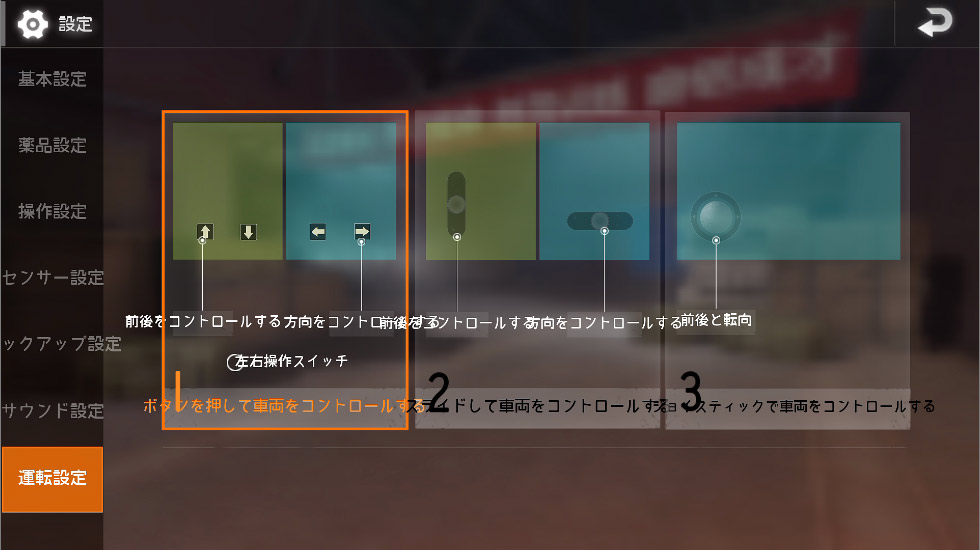 ビークル(車両)操作時の操作方法の設定。3がシンプルで使いやすい。
